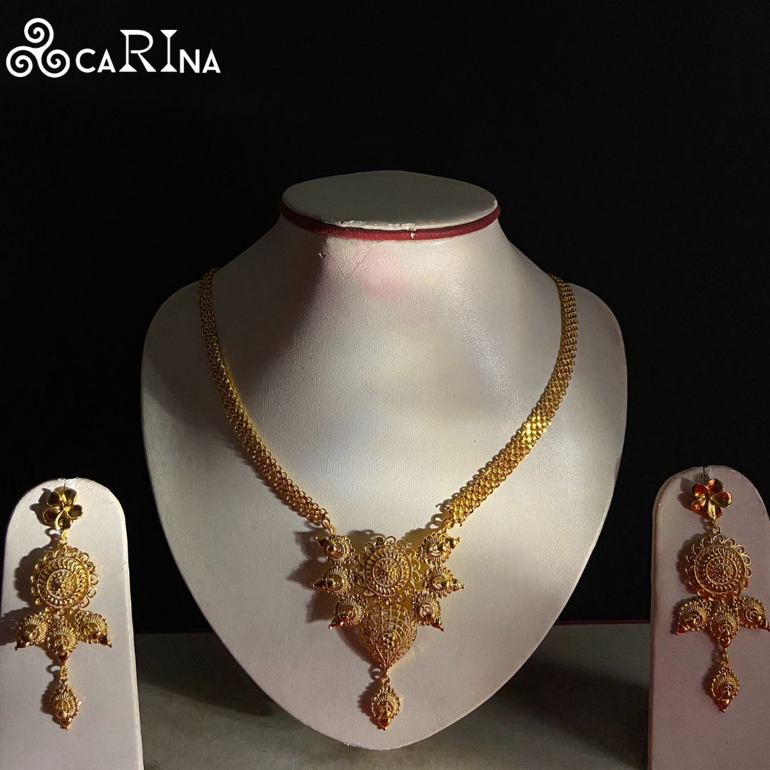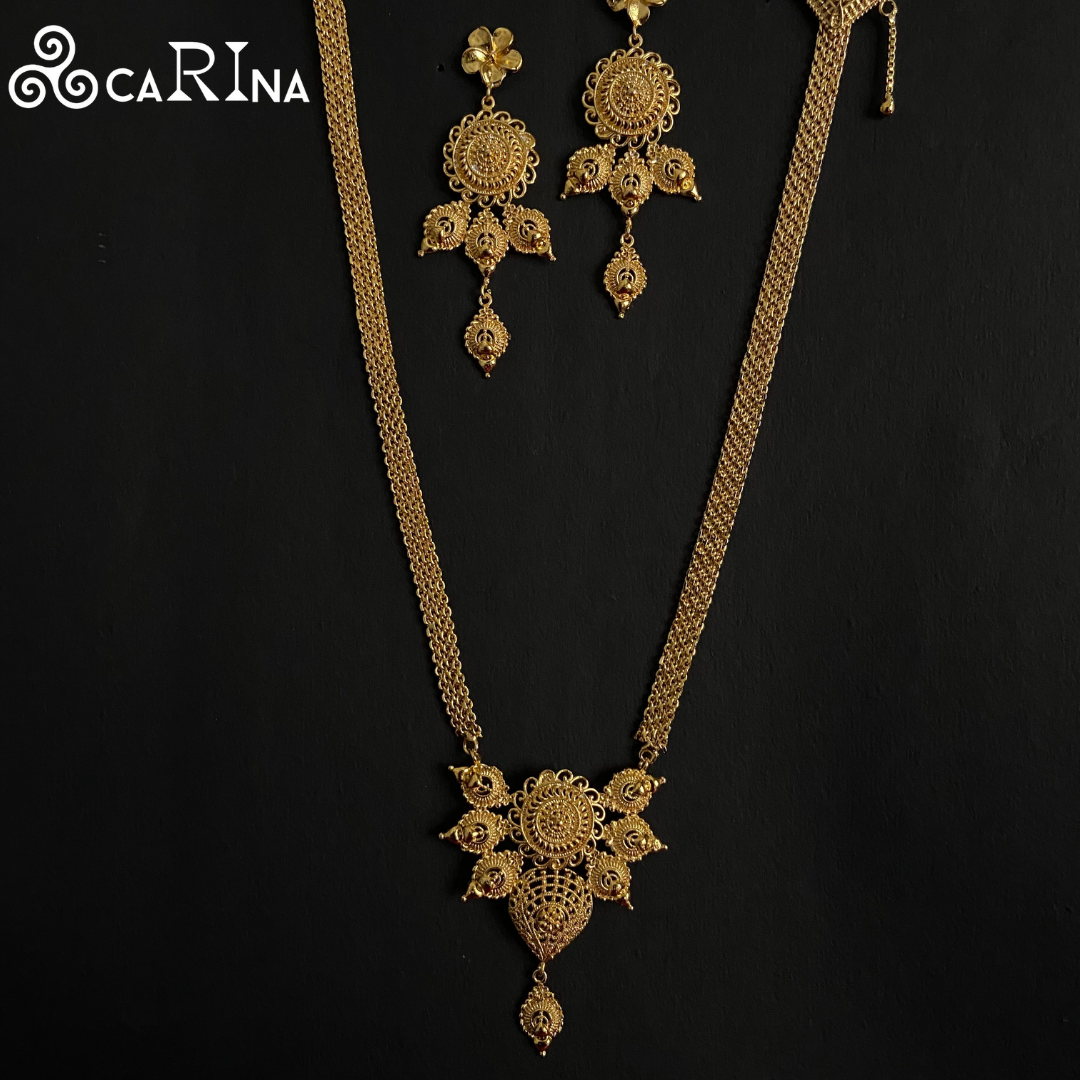 Bring a regal touch to your attire with the Antique Floral Gold Necklace Set from the Carina Royal Heritage Collection. This exquisite set includes a broad golden necklace adorned with intricate floral filigree work and matching statement earrings. The classic design reflects traditional Indian artistry, making it perfect for weddings, festive occasions, and special celebrations.