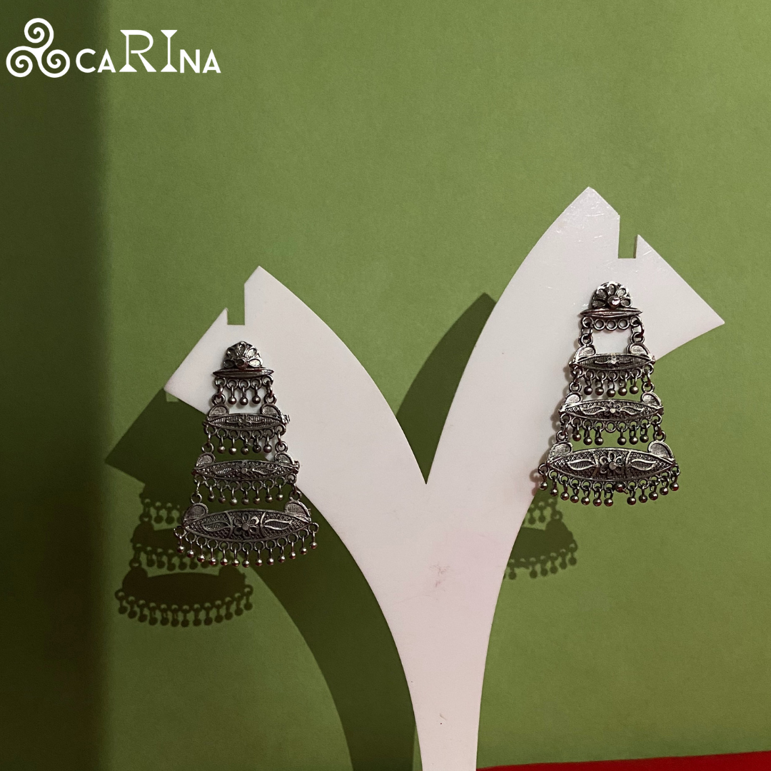 Step into tradition with a modern twist wearing the Classic Oxidized Silver Jhumka from the Carina Ethnic Charm Collection. These beautifully tiered jhumkas feature intricate carvings and tiny ghungroo drops that produce a gentle chime with every move. Perfect for ethnic outfits, festivals, or fusion looks, these earrings are a must-have for every jewelry lover.