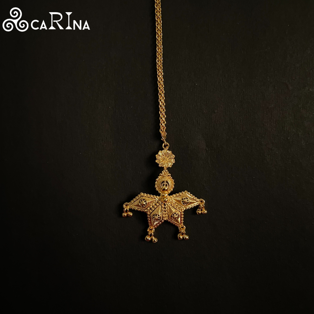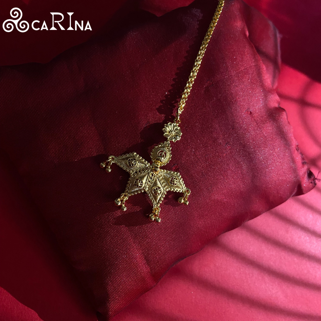 The Garuda Vilasam tikli embodies the spirit of ancient Indian mythology. Inspired by the majestic wings of Garuda, this piece features intricate gold work and delicate motifs that reflect traditional South Indian temple craftsmanship. It is more than just an ornament – it’s a crown jewel of confidence and cultural pride.