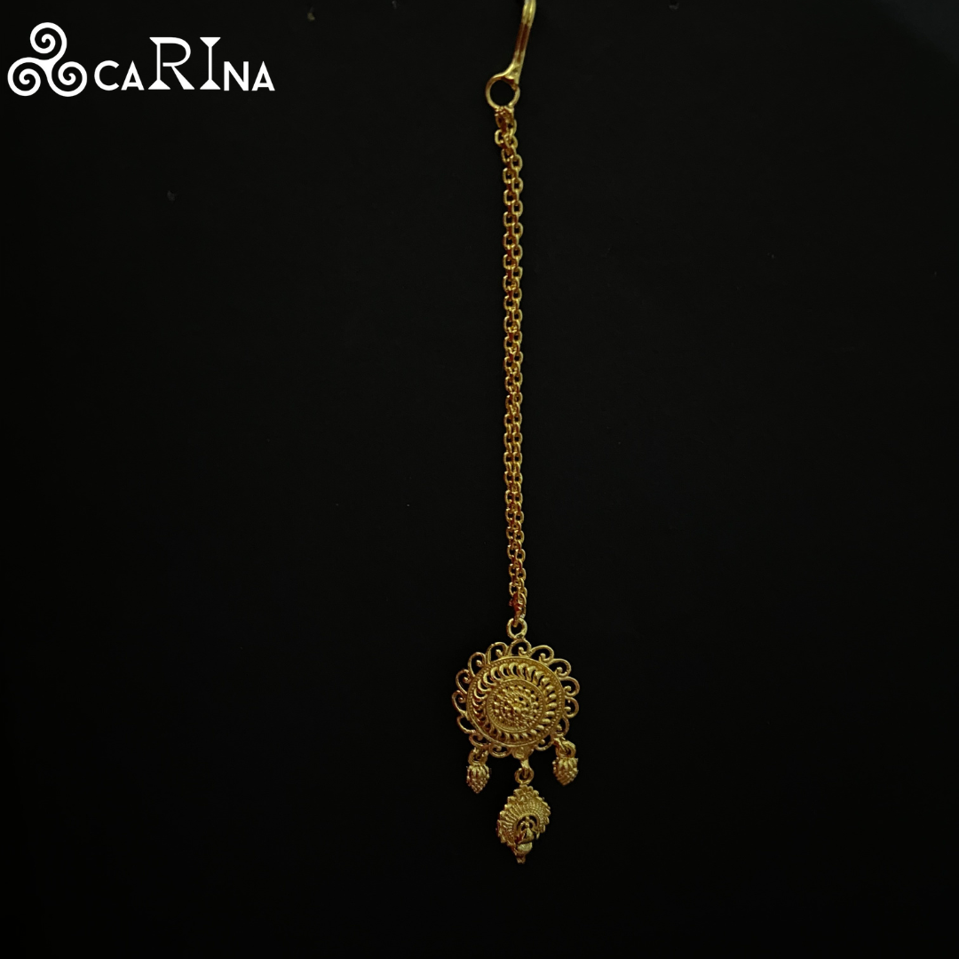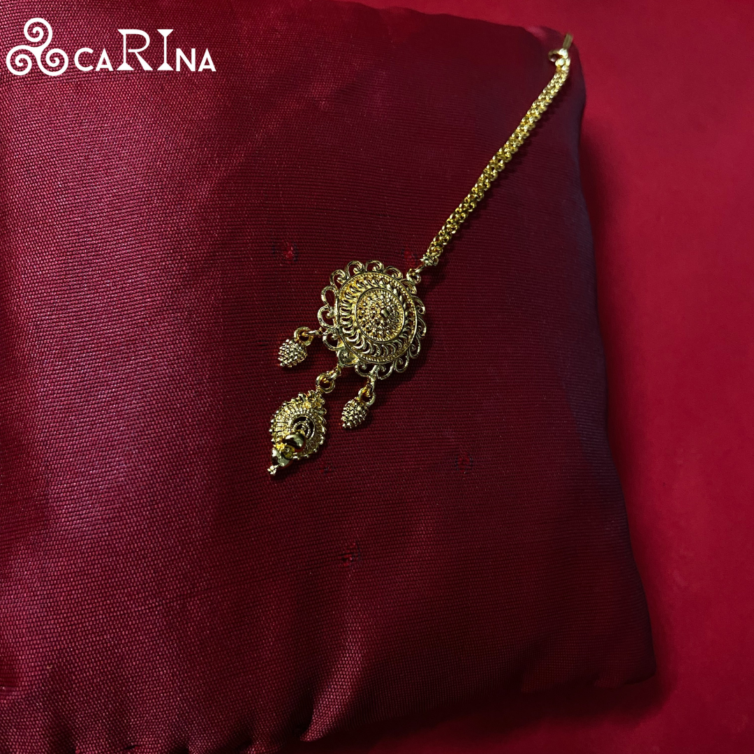 Crafted in resplendent gold, the Kanaka Nayanam tikli is a celebration of timeless Indian artistry. The radiant sunburst motif symbolizes prosperity and grace, while the dangling droplets add a touch of classic temple-inspired beauty. Whether paired with a bridal lehenga or worn for a traditional celebration, this piece brings a regal glow to every look.