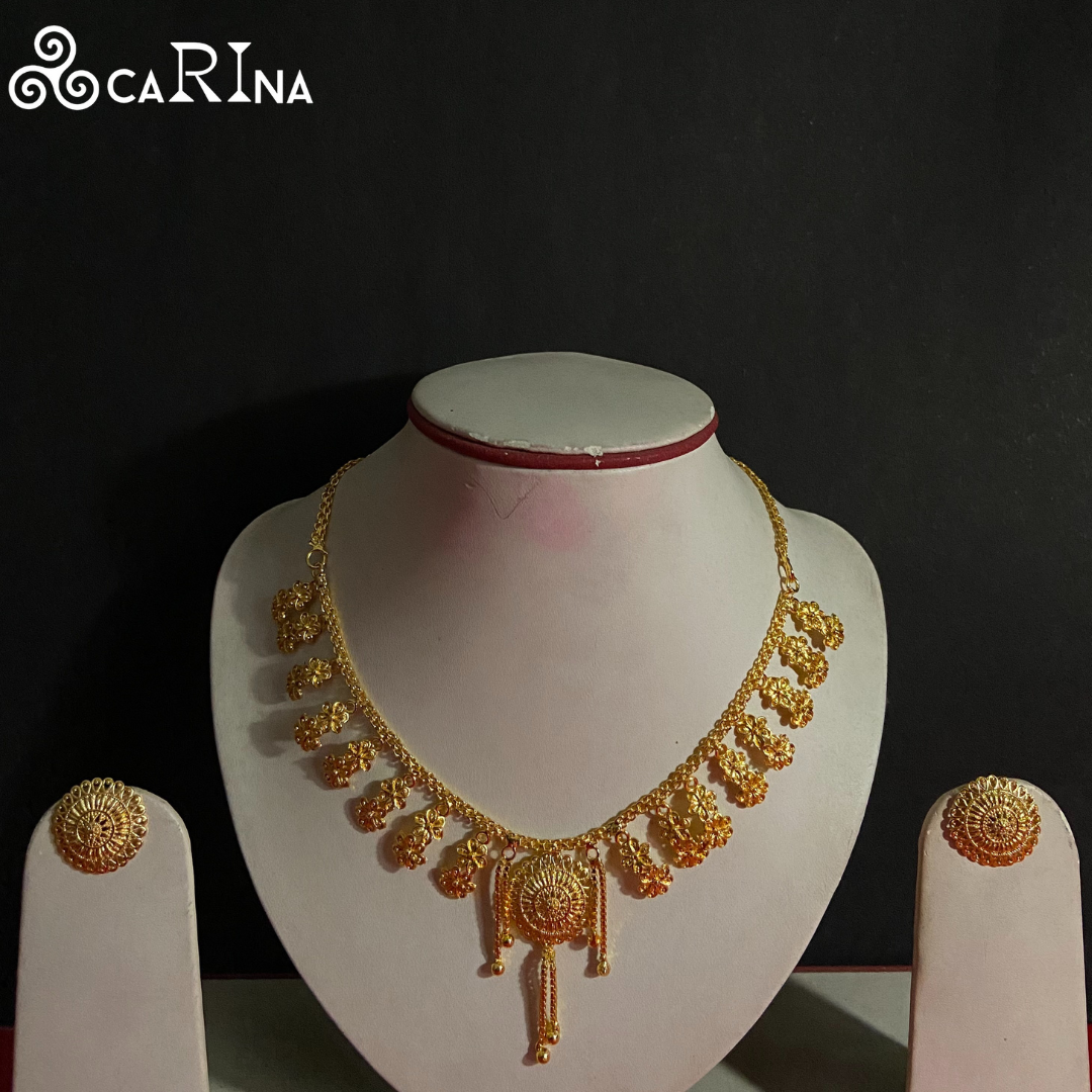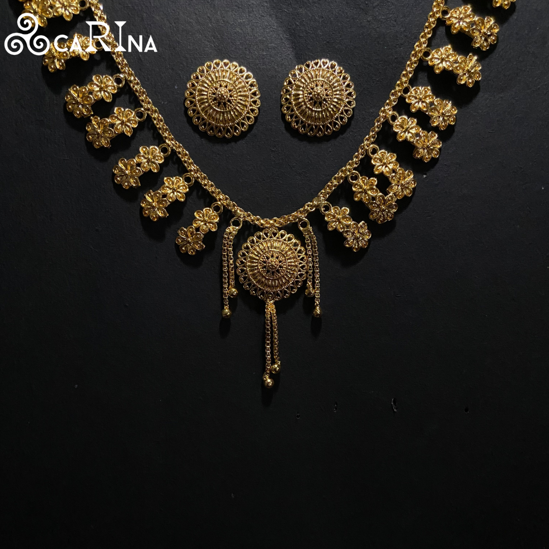 Illuminate your beauty with the Meira Bliss Set, a perfect blend of heritage charm and contemporary elegance. Crafted in intricate filigree gold work, this necklace set is adorned with floral motifs and graceful danglers that create a rhythmic dance of light and form. The matching stud earrings add subtle sophistication, making this set ideal for festive gatherings and modern traditional looks alike.