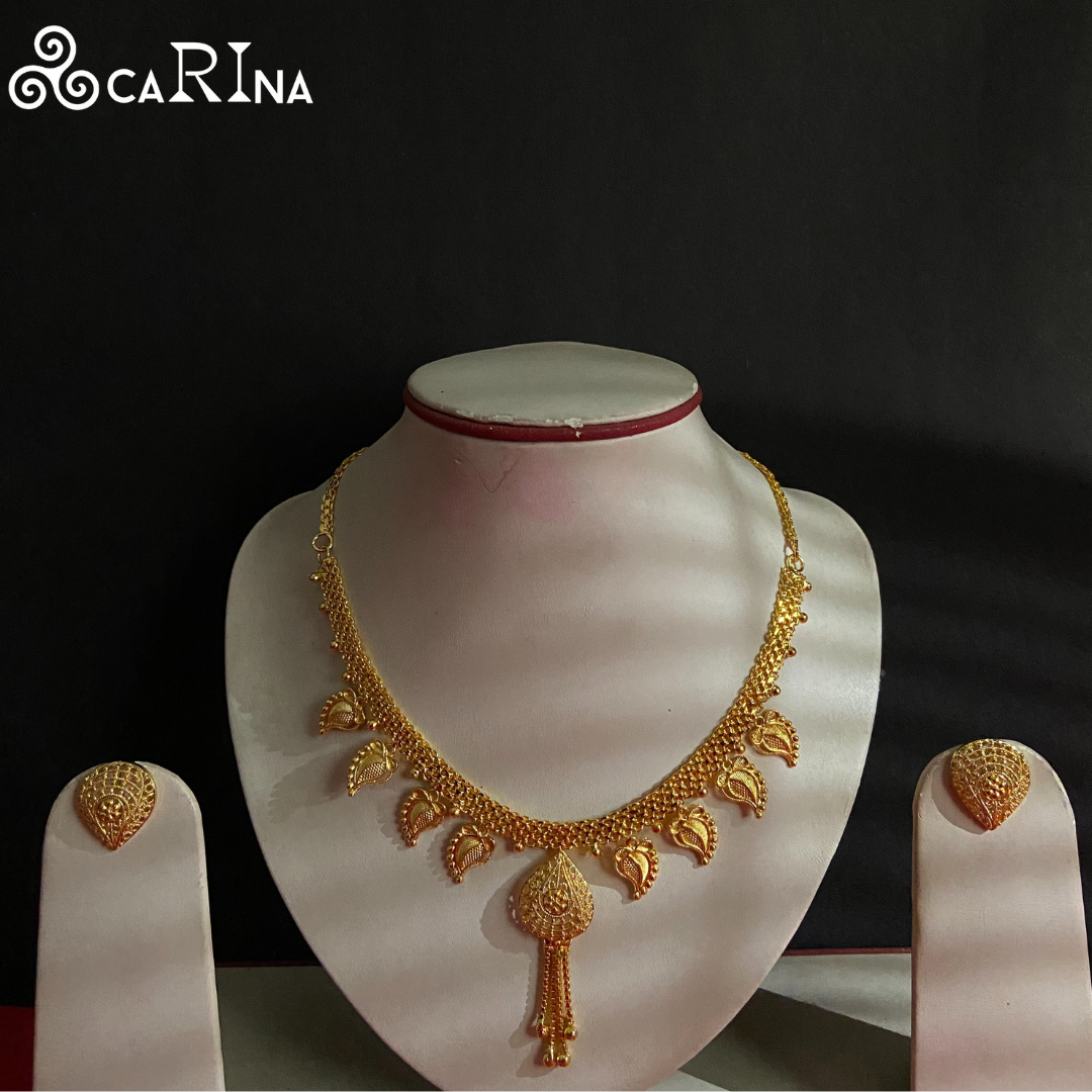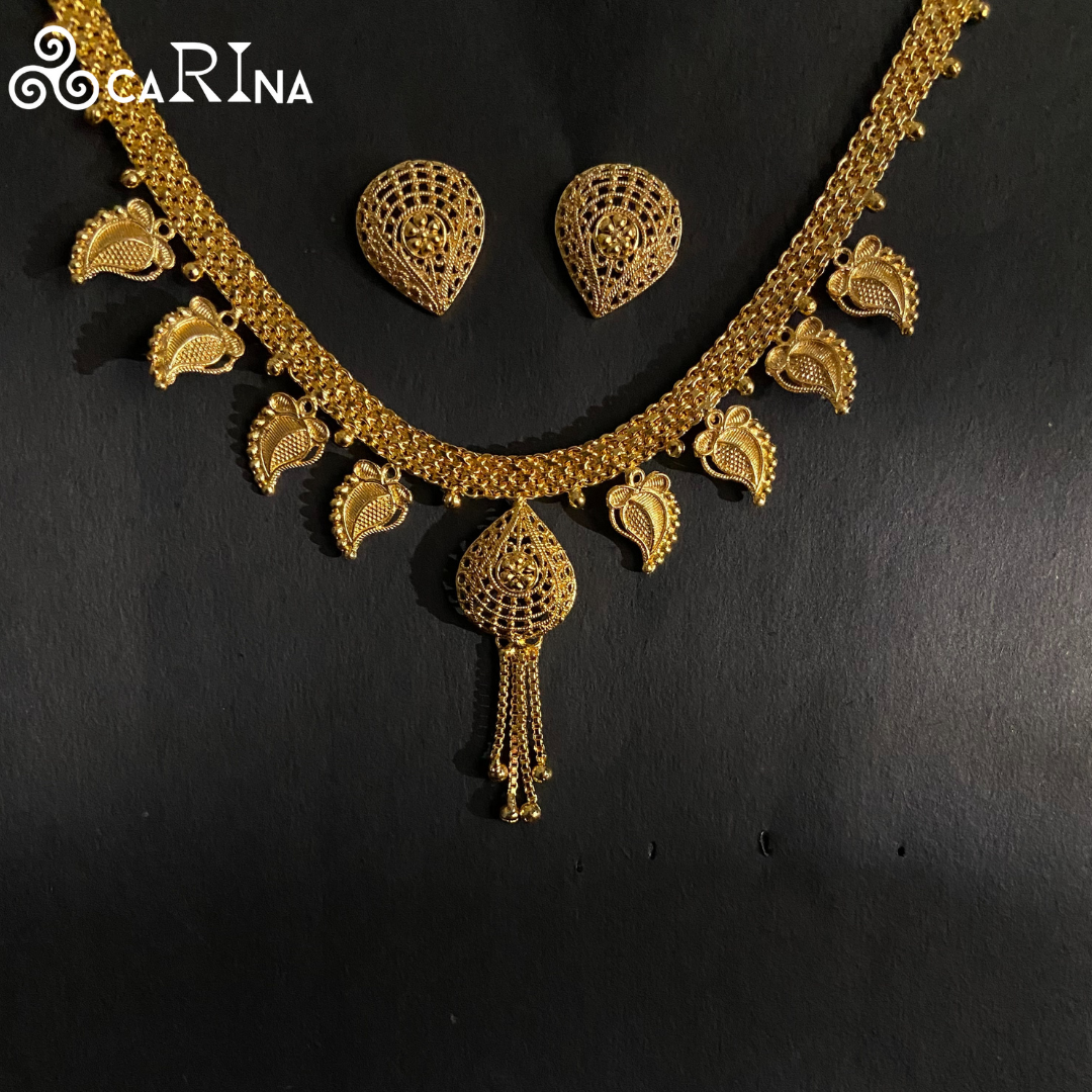 The Padma Kalika Necklace Set is a graceful ode to traditional craftsmanship, showcasing paisley-inspired motifs and a statement pendant that radiates elegance. This exquisite set, featuring a beautifully detailed necklace and matching earrings, draws inspiration from temple jewelry designs and adds a divine charm to your ethnic look. A perfect pick for weddings, festivals, and special occasions.
