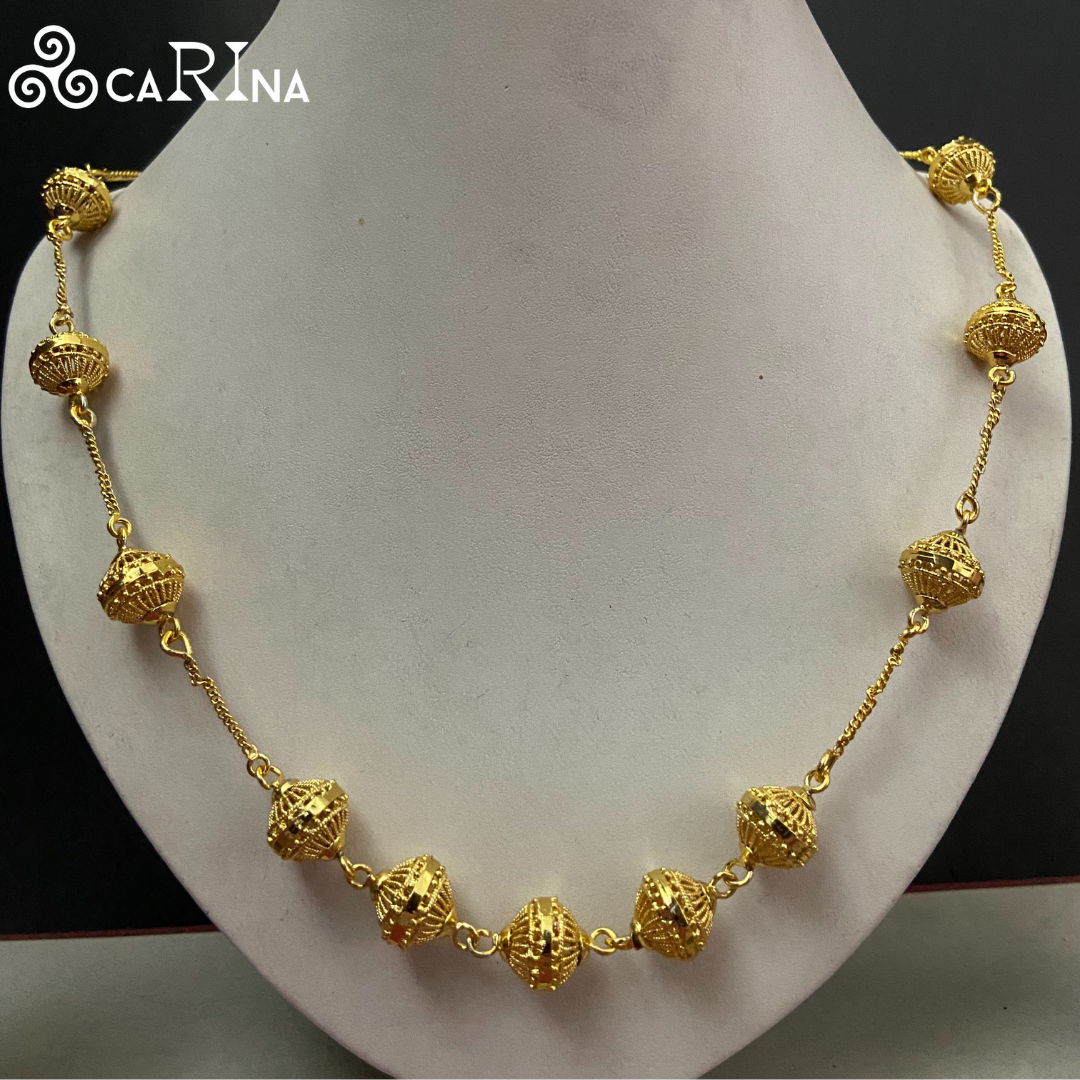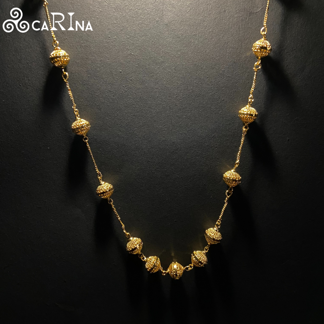 Make a bold statement with this Regal Sphere Bead Necklace, featuring intricately crafted golden spherical beads that exude traditional elegance. Each bead is designed with detailed lattice-style work, adding depth and a luxurious texture to the overall design. Connected by delicate gold-plated chain links, this necklace blends vintage charm with a contemporary edge. It’s an exquisite choice for weddings, festive celebrations, or to elevate your ethnic attire.