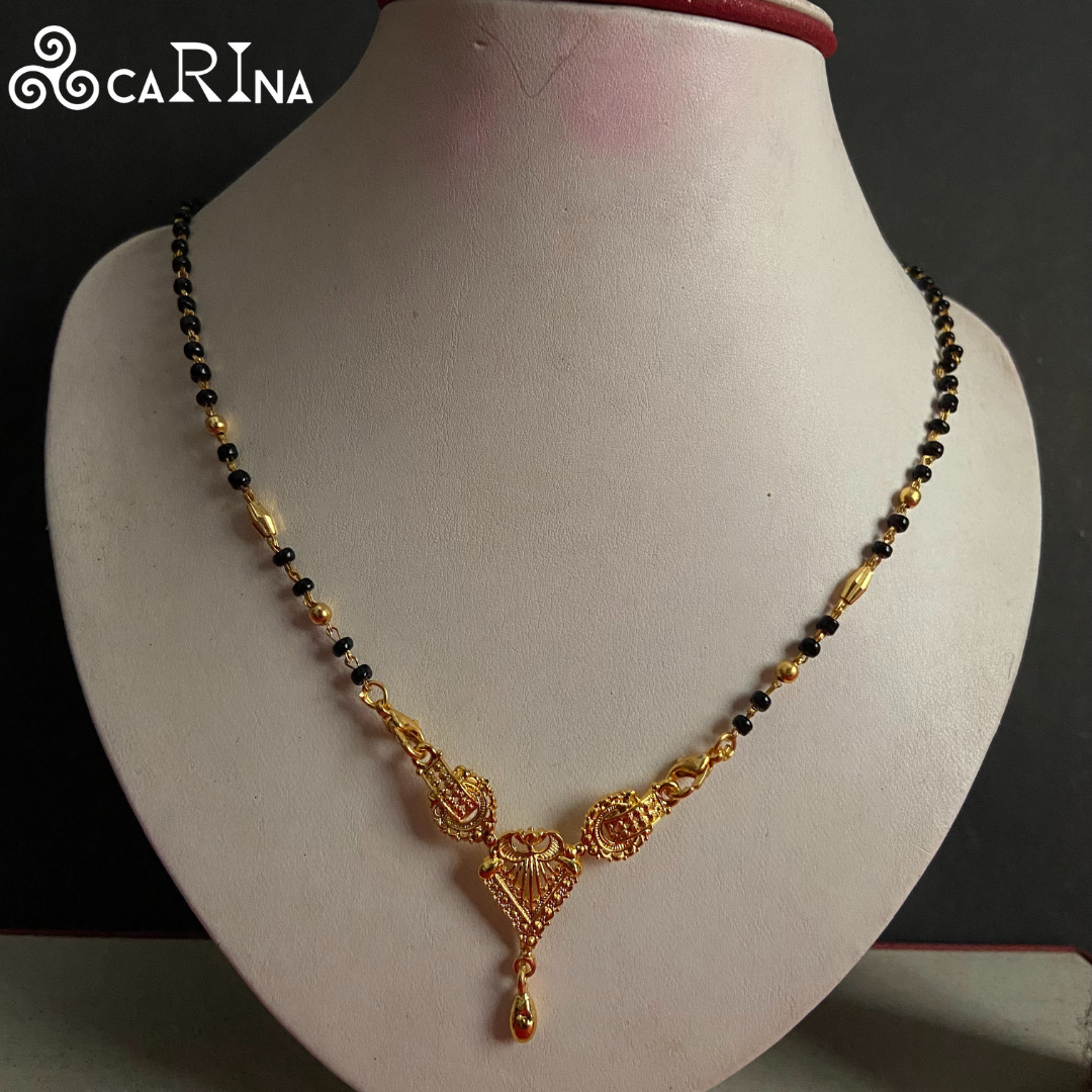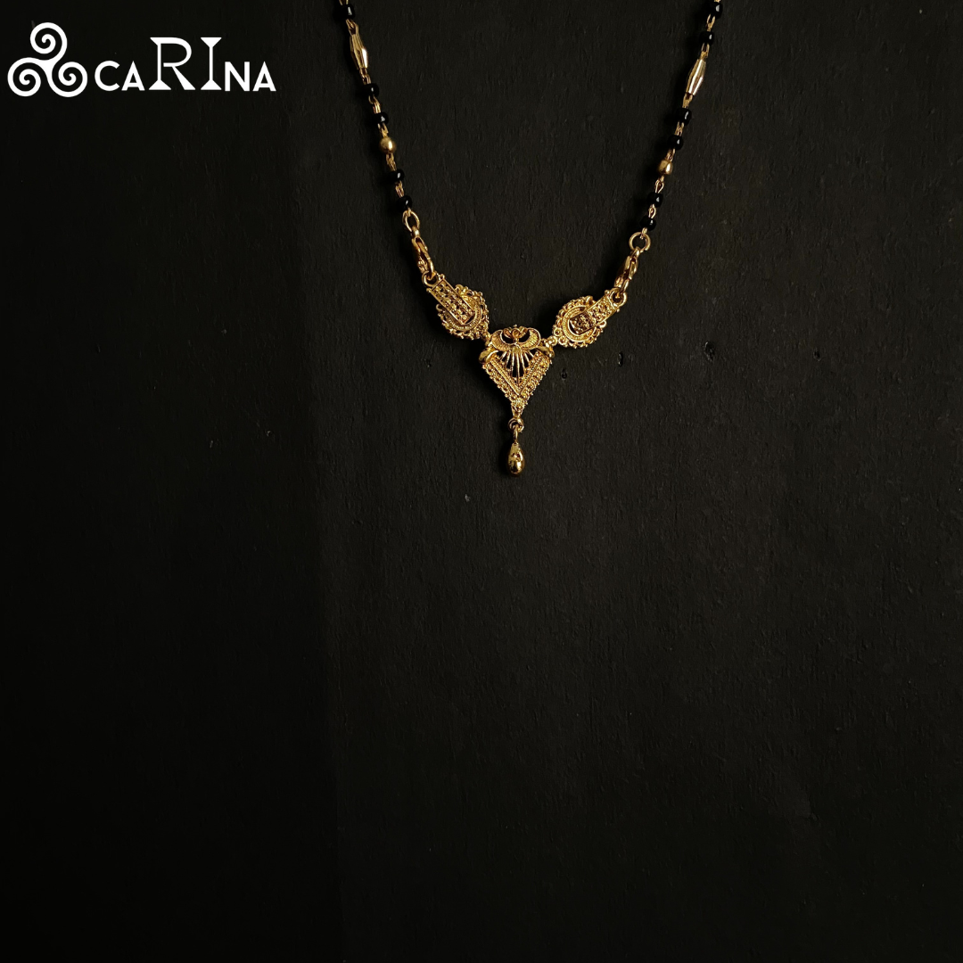 The Sanskriti Sutra mangalsutra is a timeless tribute to cultural heritage. Showcasing a fan-shaped center pendant flanked by delicate ornamental motifs, this piece embodies sophistication and traditional finesse. Crafted to reflect elegance in simplicity, it's a perfect balance between grace and symbolic meaning.