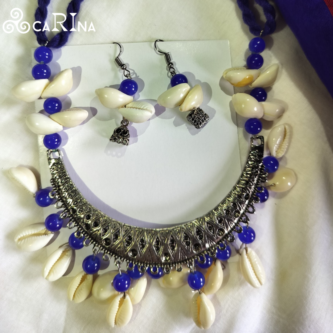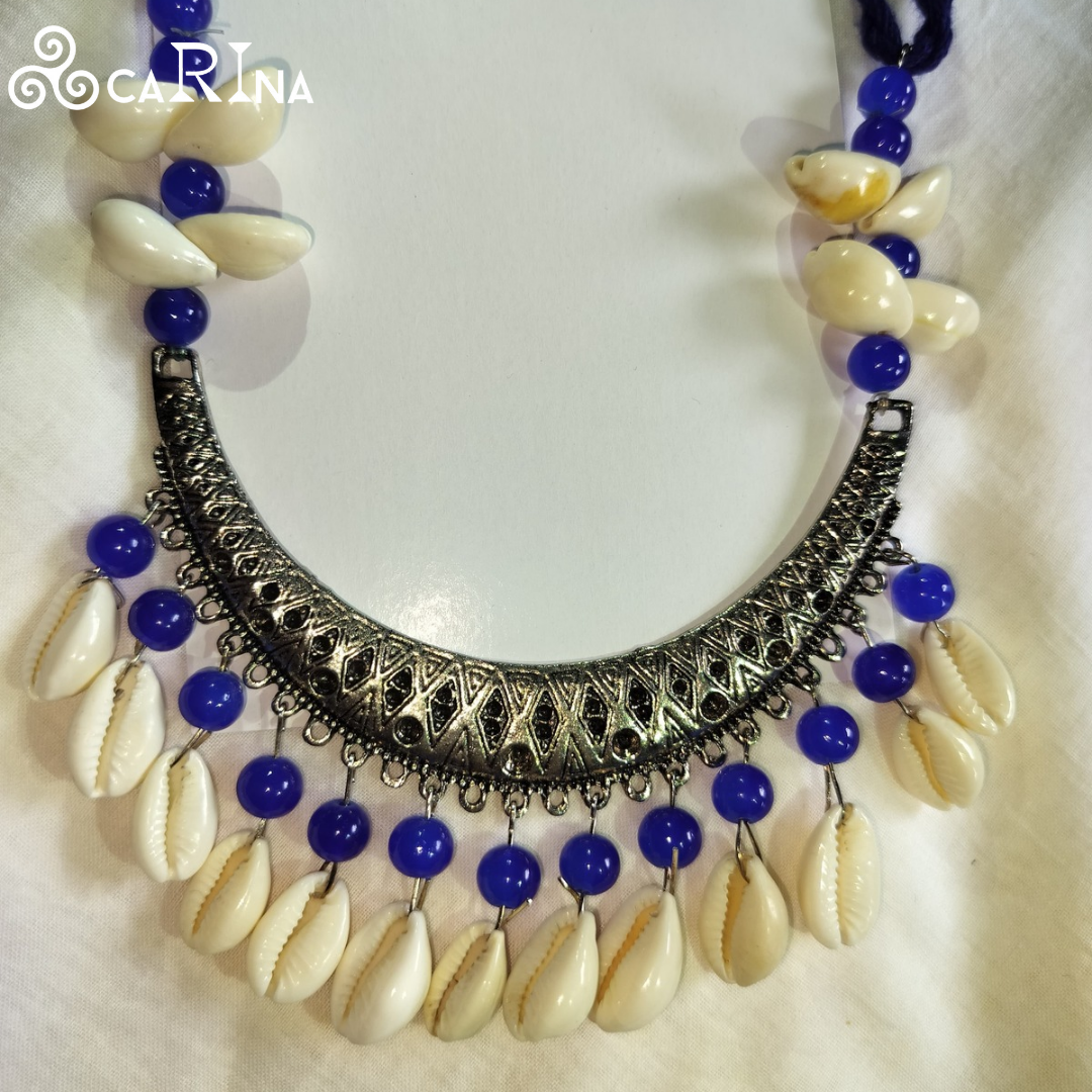 Dive into coastal elegance with Carina’s ShankhaBlue Shell Jewelry Set. This handcrafted statement set features authentic cowrie shells, vibrant royal blue beads, and a bold oxidized silver crescent pendant, creating a tribal-chic look that channels both tradition and modern style.